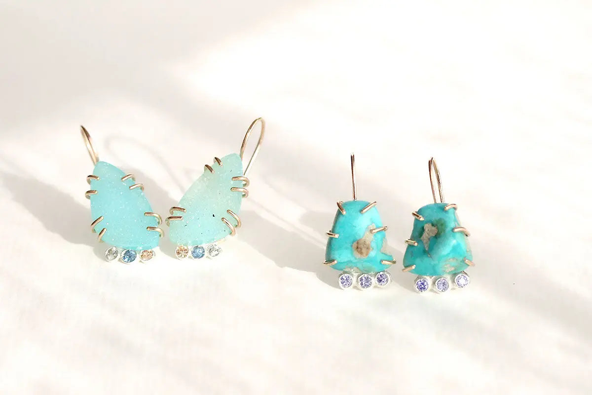 Set in a unique mix of 14k gold-filled and sterling silver, these earrings are truly one of a kind—a bold fusion of raw earth and refined elegance.