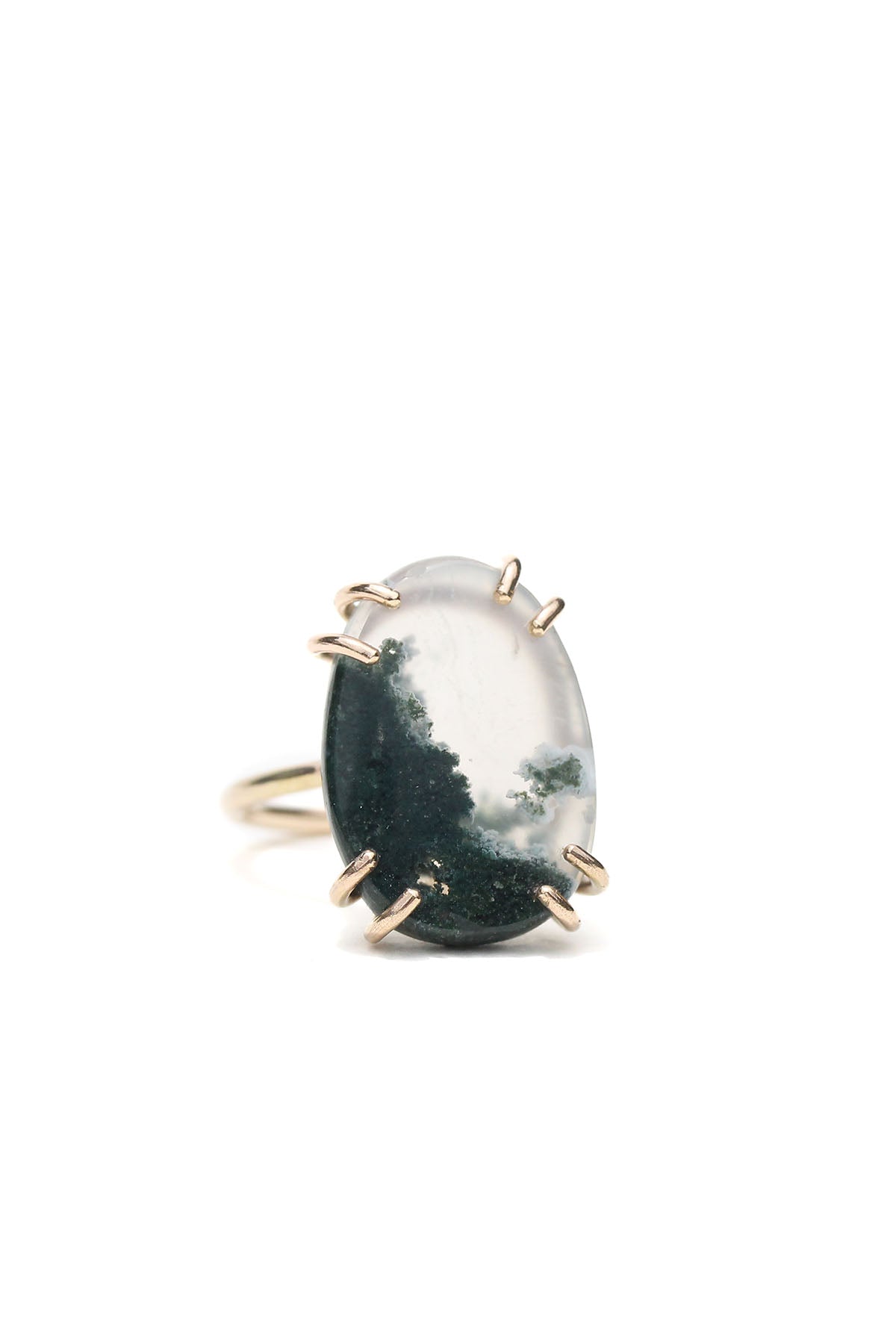 Featuring a one-of-a-kind green moss agate gemstone that evokes an underwater world, this ring is beautifully prong set with 14k gold-filled. Moss agate stone measures approximately 2cm/1.5cm